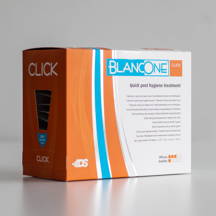 Yhdistämällä CLICK-valkaisu hampaiden puhdistukseen, asiakkaalle voidaan tarjota pinnallisten värjäytymien poiston lisäksi edulliseen hintaan syväpuhdistetut hampaat ja entistä kirkkaampi hymy kevytvalkaisulla. CLICK soveltuu erinomaisesti myös aiemmin valkaistun hampaiston ylläpitohoitoon, ja hoitoa voidaan toistaa jopa neljä kertaa vuodessa. Pakkaus sisältää kaksitoista erikseen pakattua valkaisuainepakettia, kahdelletoista potilaalle.